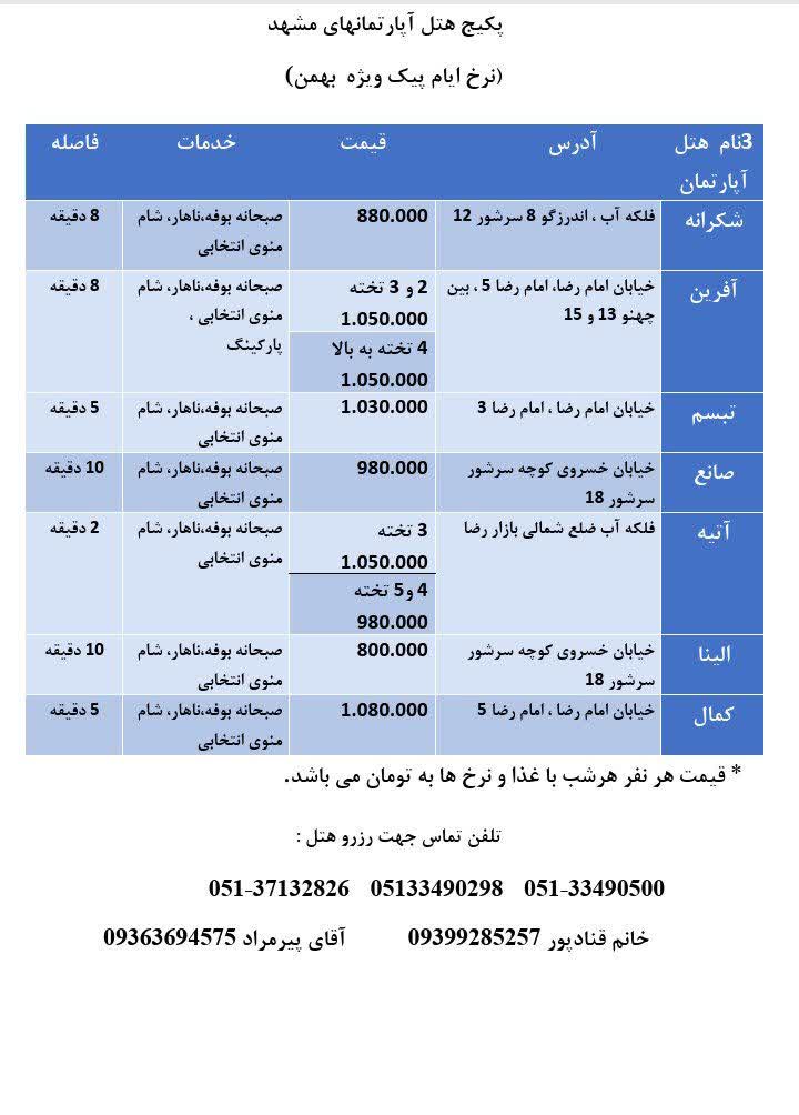 پکیج هتل آپارتمان های مشهد نرخ ویژه ایام غیرپیک ویژه بهمن ماه